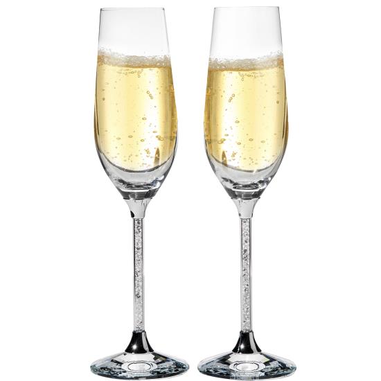 T his charming set of 2 elegant crystal champagne glasses is sure to add a touch of elegance to any party. The hollow stem contains tens of tiny clear crystals that sparkle in the light and the design is simple yet eye catching! Truly functional elegance, give it as a gift or use at your next party!