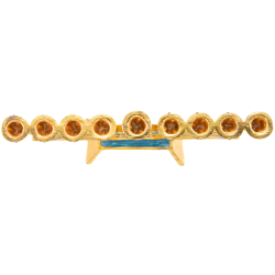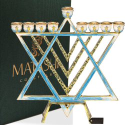 Hand Painted Blue Enamel Menorah Candelabra with a Star of David Design Embellished with Gold Accents and High Quality Crystals by Matashi