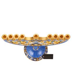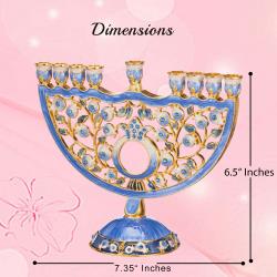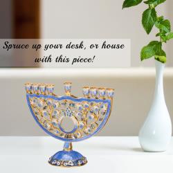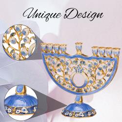 Hand Painted Blue Enamel Pomegranate Design Menorah Candelabra Embellished with Gold Accents and High Quality Crystals by Matashi