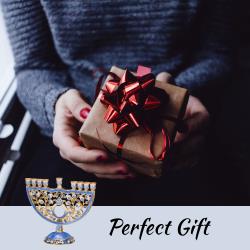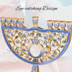 - With a blue and white color motif, this menorah is a thing of beauty. It is designed with blue and white pomegranate and floral design. The perfect gift for a spiritual someone in your life as a decoration or religious symbol!