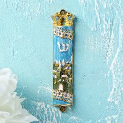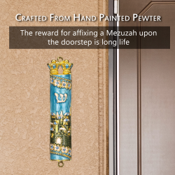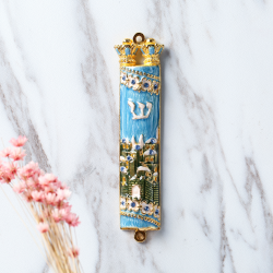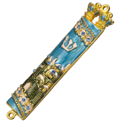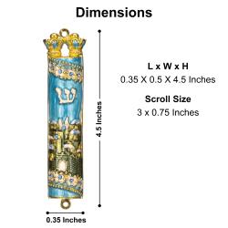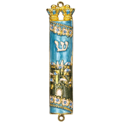 Hand Painted Blue & Green Enamel Mezuzah with Jerusalem City Design with Gold Accents and High Quality Crystals by Matashi