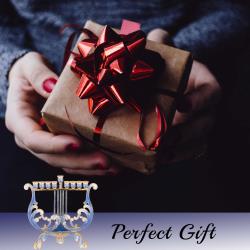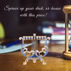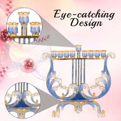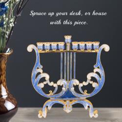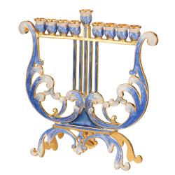 - This uniquely crafted Harp Menorah is a centerpiece on its own. Hand-painted in blue and ivory and embellished with gold accents and crystals makes this a one-of-a-kind piece. This Menorah will look just as good on Hanukkah as it will in the living room! The perfect gift for a spiritual someone in your life as a decoration or religious symbol!