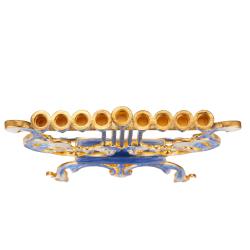 Hand Painted Blue and Ivory Harp Menorah Candelabra, Embellished with Gold Accents and High Quality Crystals by Matashi