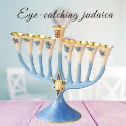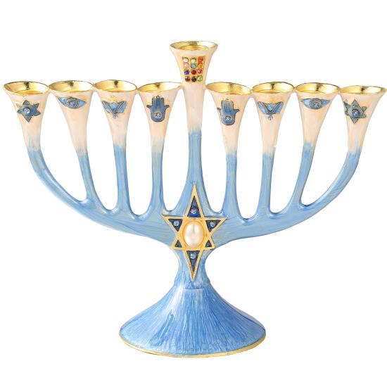 - With a blue and white color motif and a Star of David in the center, the 8 branches stand majestically united. Each branch has an additional Judaica symbol; a small star of david, evil eye, hamsa and the Priestly Breastplate in the center. The perfect gift for a spiritual someone in your life as a decoration or religious symbol!