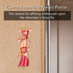 Hand Painted Red & Pink Enamel Mezuzah Embellished with a Pomegranate Floral Design with Gold Accents and High Quality Crystals by Matashi