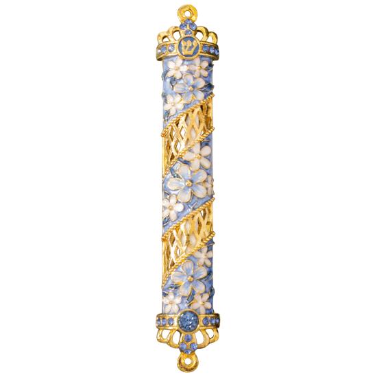 Matashi Dark Blue Flower Jeweled enamel Mezuzah with Gold Accents and Stunning Crystals, Jewish Mezuzah with Scroll for Door, Hand Painted Judaica Gift for Home Blessing and Protection