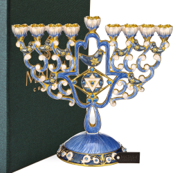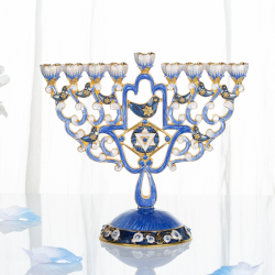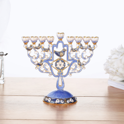 Matashi Hand Painted Enamel Menorah Candelabra with Hamsa & Doves Design, Embellished with Gold Accents and High Quality Crystals
